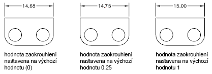 Zaokrouhlit lze hodnoty všech kót kromě úhlových. Pokud například definujete hodnotu zaokrouhlení 0.25, všechny vzdálenosti se zaokrouhlí na nejbližší jednotku 0.25. Počet číslic zobrazených za desetinou čárkou závisí na nastavení přesnosti u primárních a alternativních jednotek a hodnotách boční tolerance.