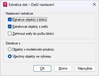 Zahrne všechny objekty v modelovém a výkresovém prostoru ve výkresu včetně informací o výkresu. Standardně zapnuto.