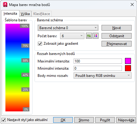 Upraví nastavení barevného schématu pro styly intenzity mračna bodů.