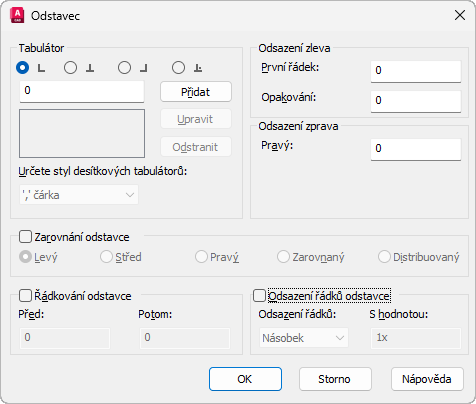 Zobrazí volby tabulátoru včetně možností přidávání a odstranění. Možné tabulátory jsou levý, střed, pravý a desetinný. Tabulátory lze také nastavit tlačítkem Výběr tabulátoru na pravítku Editoru na místě.