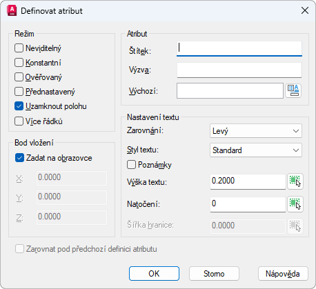 Určuje umístění atributu. Zadejte hodnoty souřadnic nebo klikněte na možnost Zadat na obrazovce a pomocí ukazovacího zařízení určete umístění atributu vzhledem k jiným objektům.