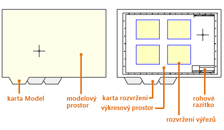 Plocha uvnitř rozvržení se nazývá výkresový prostor, do kterého lze přidat rohové razítko, zobrazit pohledy se změněnými měřítky modelového prostoru v rámci výřezů rozvržení a vytvořit tabulky, výkazy, poznámky a kóty výkresu.