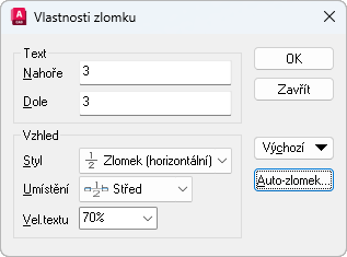 Určuje formát textu ve zlomku: vodorovný zlomek, šikmý zlomek, tolerance nebo desetinný.