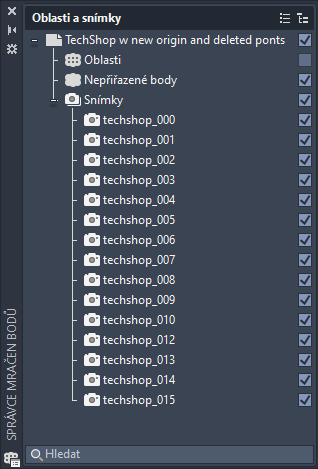 Vyhledávání podle názvu mračna bodů, oblasti nebo souboru snímku.