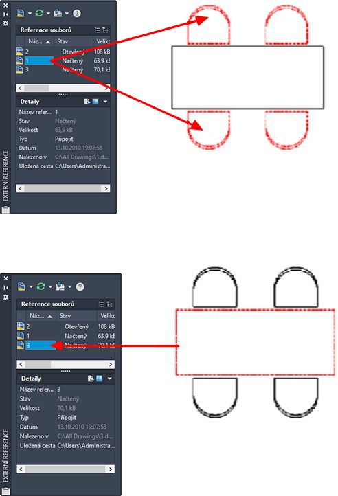 Libovolný výkresový soubor lze k aktuálnímu výkresu připojit jako externí referenci neboli xref.