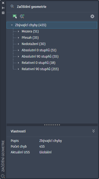 Otevře paletu Začištění geometrie, na které jsou zobrazeny potenciální chyby mezer, přesahů, nedotažení a úhlové chyby aktuálního výkresu.
