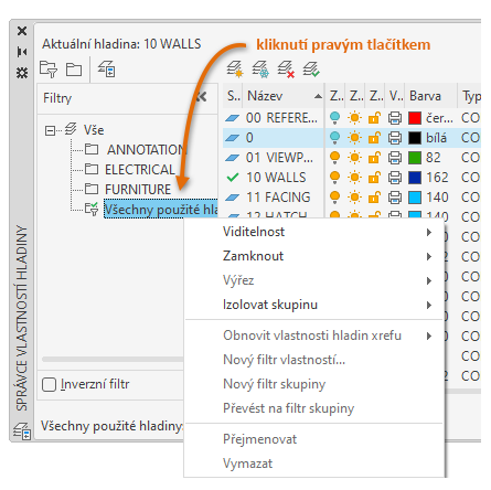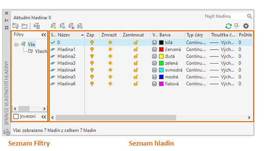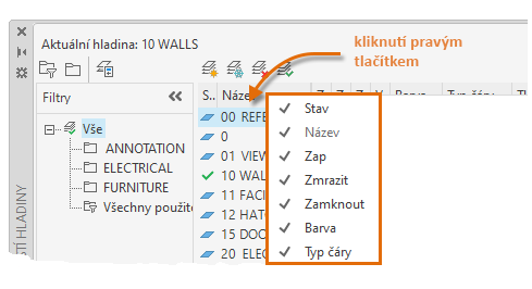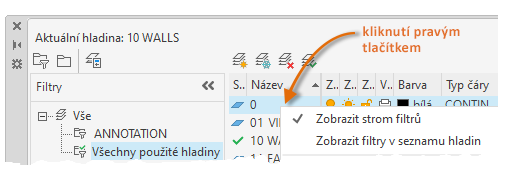 Zobrazí seznam filtrů hladin ve výkresu. Kliknutím na