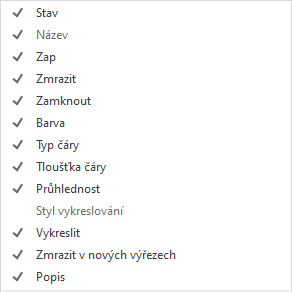 Zobrazí seznam všech sloupců podle názvu. Zaškrtnutí indikuje, že sloupec je zahrnutý v zobrazení. Kliknutím na název sloupce lze sloupec zobrazit nebo skrýt. Volby Zmrazit ve výřezu, Barva výřezu, Typ čáry a Styl vykreslování výřezu jsou dostupné, pouze když je aktivní výřez rozvržení.