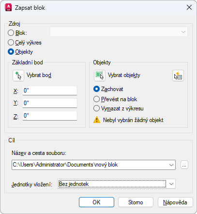 Po jejich uložení převede vybraný objekt nebo objekty na blok v aktuálním výkresu.