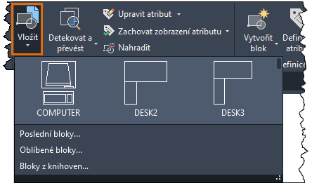 Na panelu Bloky na kartě Výchozí se v aktuálním výkresu po kliknutí na možnost Vložit zobrazí galerie bloků bez zobrazení palety Bloky. Ostatní dvě možnosti, Poslední bloky a Bloky z knihoven, zobrazí paletu Bloky na odpovídající kartě.