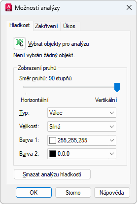 Karty na dialogu obsahují nastavení k úpravě všech tří typů analýzy těles a povrchů: Zebra analýzy (spojitosti), zakřivení a úhlu zkosení.