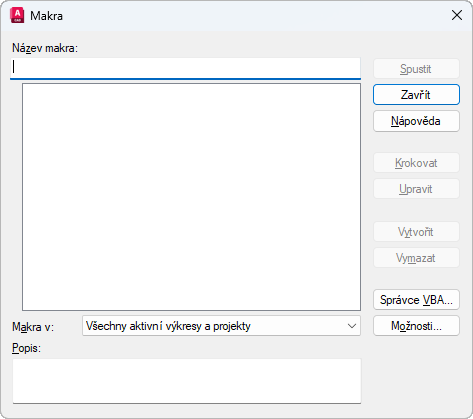 Určuje projekt nebo výkres, jehož makra jsou pak dostupná v seznamu maker. Není-li váš projekt nebo výkres na seznamu, kliknutím na Správce VBA jej zaveďte.