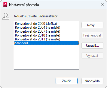 Zobrazí dialog Upravit nastavení převodu, ve kterém je možné určit možnosti pro vybraný převod výkresů.