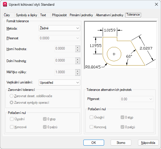 Nastaví maximální neboli horní hodnotu tolerance. Pokud jako metodu zvolíte Symetricky, bude tato hodnota použita jako tolerance. (Systémová proměnná DIMTP)
