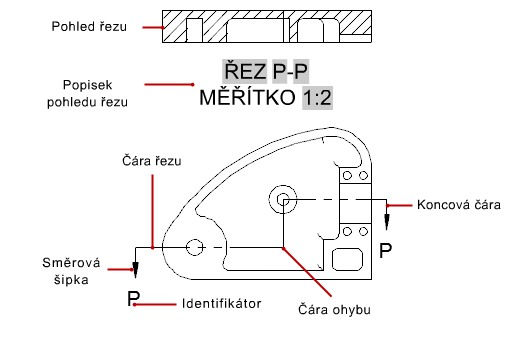 Pohled řezu dokumentace modelu je promítnutý pohled z existujícího pohledu výkresu, kde použijete čáru řezu k vytvoření výřezu v pohledu výkresu, aby bylo možné zobrazit jeho vnitřek.