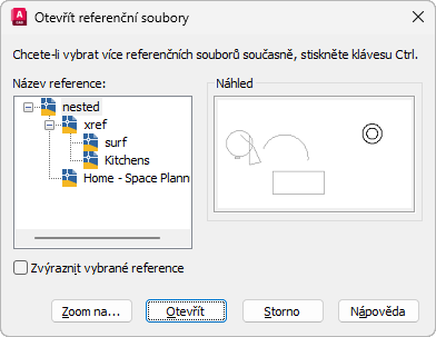 Dialog Otevřít referenční soubory zobrazí referenční strom se všemi vnořenými externími referencemi. Zdrojový soubor pro vybrané externí reference se otevře v samostatném okně výkresu, kde lze výkres upravit, uložit a poté zavřít.
