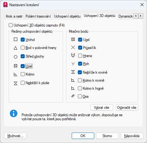 Zapíná a vypíná uchopení 3D objektů. Jednotlivá uchopení 3D objektů nastavená pod položkou Režimy uchopení 3D objektů jsou aktivní, když je uchopení zapnuto. (systémová proměnná 3DOSMODE)