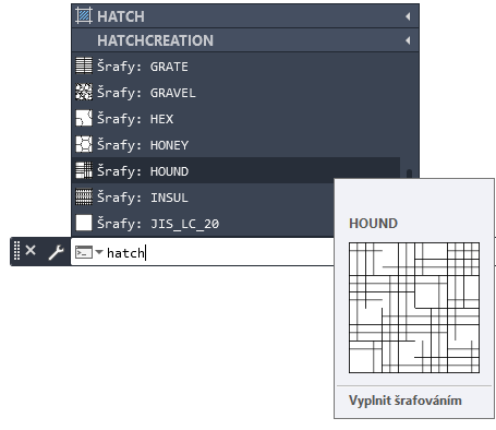 Příklad : Předpokládejme, že chcete vložit šrafovací vzor. Pokud na příkazovém řádku zadáte šrafy a stisknutím klávesy tabulátoru začnete procházet možnosti, seznam návrhů příkazového řádku se rozbalí tak, aby zahrnoval dostupné šrafovací vzory. Další šrafy a gradienty zobrazíte přetažením posuvníku. Můžete zobrazit náhled každé možnosti posunutím kurzoru nad příslušný název.