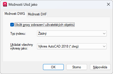 Pokud ukládáte částečně otevřený výkres, který již neobsahuje index hladin a prostorový index, není toto nastavení dostupné.