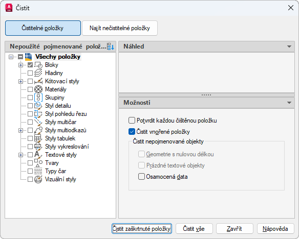 Zobrazí seznam pojmenovaných objektů, které nejsou používané v aktuálním výkresu a které jsou čistitelné. Kliknutím na znaménko plus nebo dvojitým kliknutím na typ objektu si můžete zobrazit seznam položek pro kterýkoli typ objektu. Můžete buď vybrat samostatnou položku, nebo všechny položky daného typu objektu.