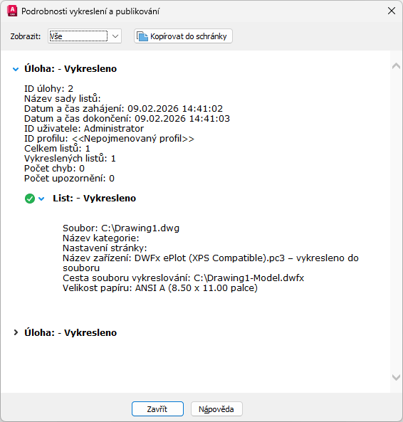 Zobrazí informace o dokončených úlohách vykreslování a publikace a listech těchto úloh.