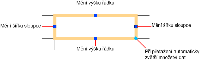 Buňku vyberete kliknutím. Uzly jsou zobrazeny ve středu ohraničení buněk. Kliknutím do jiné buňky do ní přesunete výběr. Přetažením uzlů na buňce rozšíříte nebo zúžíte buňku a její sloupec.