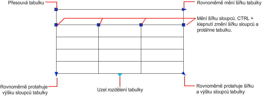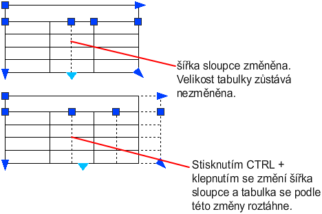 Když změníte výšku nebo šířku tabulky, změní se pouze řádek nebo sloupec přilehlý k vybranému uzlu. Tabulka si zachová výšku nebo šířku. Chcete-li změnit velikost tabulky v poměru k velikosti upravovaného řádku nebo sloupce, stiskněte při používání uzlu sloupce klávesu Ctrl.