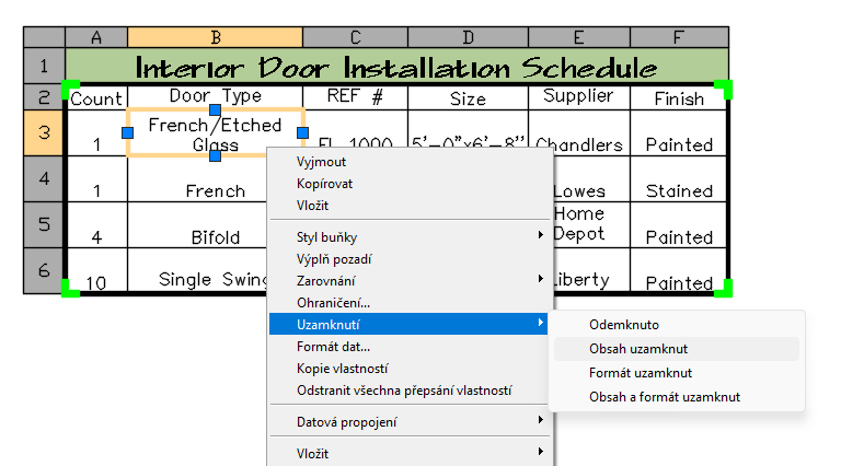 Ve výchozím nastavení jsou všechny buňky v tabulce extrakce dat uzamčeny proti úpravám a odemčeny pro změny formátování. Buňky lze odemknout nebo uzamknout proti úpravám dat a formátování pomocí místní nabídky.