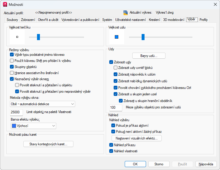 Zobrazí náhled výběru, když nejsou aktivní žádné příkazy. (Systémová proměnná SELECTIONPREVIEW)