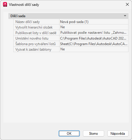 Určuje soubor výkresové šablony (DWT) a název rozvržení, který je použit při tvorbě nových výkresových souborů v této podsadě.