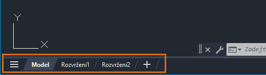 Ve výchozím nastavení se v levém dolním rohu kreslicí plochy zobrazí karta Model a několik karet pojmenovaných rozvržení.