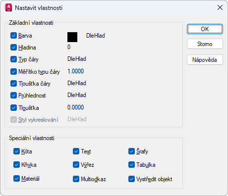 Změní styl vykreslování cílového objektu na styl vykreslování zdrojového objektu. Pokud pracujete ve stylu vykreslování závislém na barvě (proměnná PSTYLEPOLICY je nastavena na hodnotu 1), tato volba není k dispozici. K dispozici pro všechny objekty kromě objektů s použitým modifikátorem roztřesených hran.