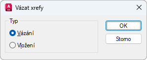 Sváže vybranou referenci DWG s aktuálním výkresem. Syntaxe pojmenovaných objektů závislých na externích referencích se změní z názevbloku|názevdefinice na názevbloku$n$názevdefinice. Tímto způsobem jsou vytvořeny jedinečné pojmenované objekty všech tabulek definic závislých na externích referencích navázaných do aktuálního výkresu.