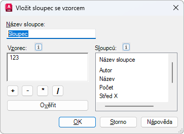 Zobrazí názvy sloupců z extrahovaných dat výkresu a externích dat (pokud bylo vytvořeno propojení). Názvy sloupců je možné dvojitým kliknutím přidat do pole Vzorec nebo přetáhnout ze seznamu Sloupec do pole Vzorec. Existující sloupce s názvy nejsou v seznamu uvedeny a nelze je použít jako hodnoty pro vytvoření dalších sloupců se vzorci.