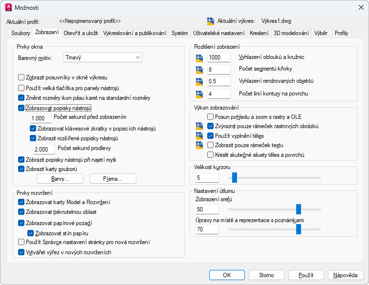 Řídí nastavení zobrazení specifické pro kreslicí prostředí.
