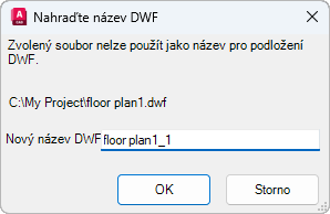 Názvy připojovaných referencí DWF nebo DWFx musí být jedinečné. Při pokusu o připojení dvou referencí DWF nebo DWFx se stejným názvem se zobrazí dialog Nahraďte název DWF.