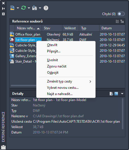 Jestliže má vámi vytvořená reference připojené externí reference nebo definice bloků, reference a její vnořené reference jsou zobrazeny v dialogu Editovat referenci, kde ji můžete vybrat. Vnořené reference jsou zobrazeny pouze tehdy, když je vybraný objekt součástí vnořené reference. Upravovat můžete najednou pouze jednu referenci. Jestliže upravujete referenci, která obsahuje objekty OLE, jsou objekty OLE zobrazeny, nelze je však upravovat.