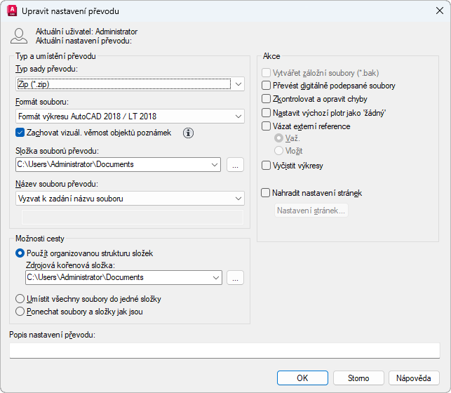 Pokud je tato volba aktivní, kontroluje výkresy na přítomnost chyby. Pokud jsou zjištěny chyby, budou výkresy automaticky obnoveny. Možnost Nastavit výchozí plotr jako „žádný“ změní nastavení tiskárny nebo plotru v sadě převodu na hodnotu Žádný. Nastavení lokální tiskárny/plotru není obvykle pro příjemce důležité.