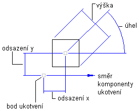 Směr v ose X je určen objektem, ke kterému je komponenta bloku ukotvena. Pokud je komponenta bloku ukotvena k bodu vložení popisku, je směr v ose X určen vzhledem k následujícímu nastavení Reference orientace na kartě Obecné: