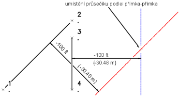 Průsečík se nachází mezi spojnicí bodů 1 a 2 s odsazením 100 stop vpravo a spojnicí bodů 3 a 4 s odsazením 100 stop vlevo.