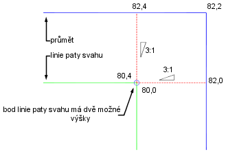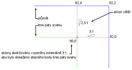 Sklon výkopu: Vytváří zemní těleso promítnutím hodnoty specifického sklonu nahoru na cíl. Sklony lze naformátovat jako hodnotu sklonu (výška:základna nebo základna:výška) nebo jako hodnotu spádu (procentní nebo desetinnou).