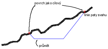 Povrch: Určuje, že promítané linie zemního tělesa budou prodlouženy z návrhové linie, dokud se nepřizpůsobí povrchu. Při vytváření zemního tělesa s použtím těchto parametrů bedete vyzváni k výběru cílového povrchu.
