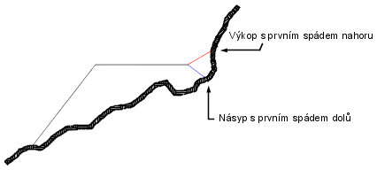 Poznámka: Technicky obě tyto situace jsou „násyp“. Aplikace Autodesk Civil 3D však zpracovává směr sklonu nahoru jako výkop a směr sklonu dolů jako násyp.