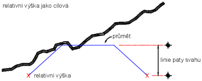 Relativní výška: Vytváří zemní těleso promítnutím na hodnotu výšky, která se měří vzhledem k výšce návrhové linie.