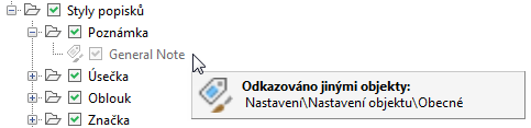 V tomto příkladu odkazuje komponenta Obecná nastavení prvku na komponentu Styl obecné poznámky. Zaškrtnutí políčka obecné poznámky tedy aktuálně nelze zrušit.