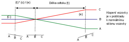 Opačný úsek definuje celkovou vzdálenost přechodu tak, aby se jednalo délku mezi rovnou korunou a plným dostředným sklonem {t}. Vzdálenost k počátku oblouku je dána jako procenta z {t} na základě proměnné {p} a vzdálenost mezi staničením základního střechovitého sklonu vozovky a rovné koruny je {t} * {c} / {e}