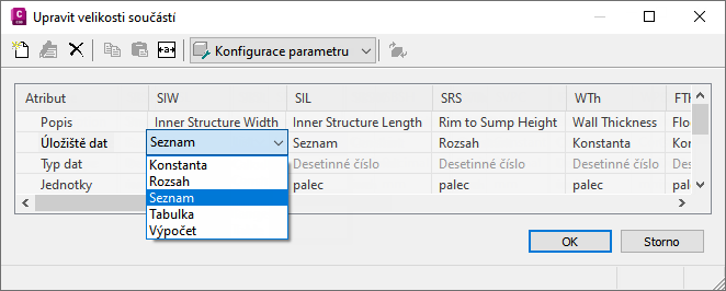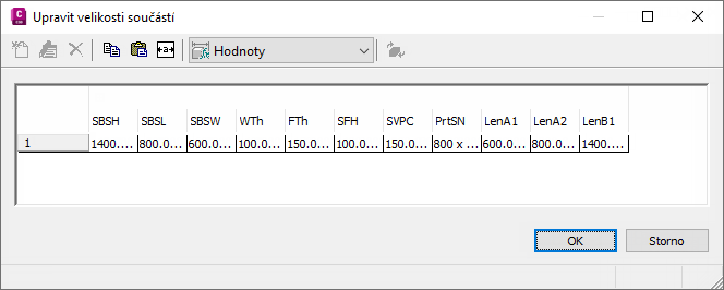 - Chcete-li přidat nové velikosti součásti, klikněte na hodnotu parametru a poté na panelu nástrojů klikněte na tlačítko Upravit.