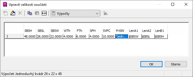- Chcete-li zadat název jedinečné vypočtené velikosti součásti, vyberte na panelu nástrojů tlačítko výpočty.