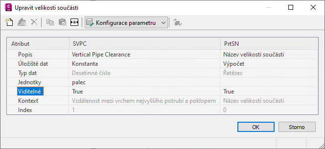 Zobrazí se dialog Upravit velikosti součástí znázorňující všechny aktuálně dostupné parametry velikosti pro vybranou součást. Jako příklad jednoduché válcovité šachty jsou k dispozici některé výchozí parametry velikosti Název velikosti součásti (NVSouč) a Vůle svislého potrubí šachty (VSPŠ).