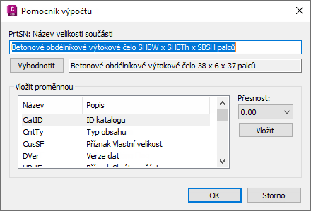 Zobrazí se řetězce výpočtů spojené s hodnotami parametru. Vzorec výpočtu pro název velikosti součásti (PrtSN) stavebního objektu může být například „SHBW x SHBTh x SBSH palcové betonové obdélníkové výtokové čelo“. Pro potrubí to může být zase FormatNumber($PID,0) + „cm betonové potrubí“.